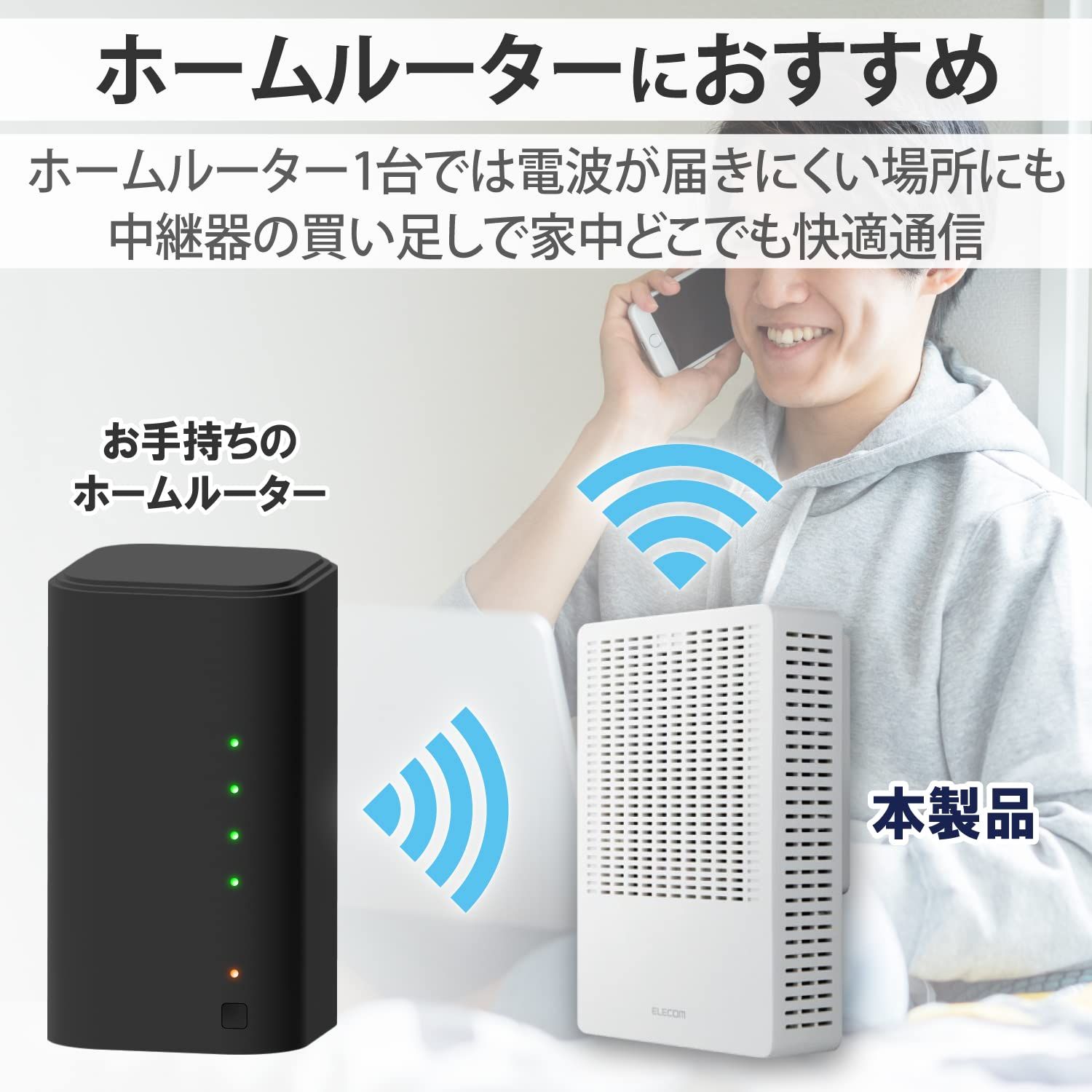 Wi-Fiルーターの電波を中継し、Wi-Fiのエリアを拡げる中継器です。インターネットが繋がりにくかった部屋にもWi-Fiの電波をしっかり届けてくれるので、テレワークやオンライン学習にも適しています。Wi-Fiルーターとの距離が離れた部屋がある住宅や、鉄筋構造や断熱材、床暖房などWi-Fiの電波を通しにくい住宅にお住まいで、「Wi-Fiの電波が届かない、届きにくい」とお困りのお客様に適しています。本製品は固定回線を利用した通常のWi-Fiルーターはもちろん、Wi-Fi