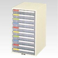 ●規格:A4判タテ型,浅型10段●外寸:幅258×奥351×高452mm●重量:5.5kg●引出内寸:幅225×奥311×高32mm●材質:本体=スチール,引出=透明スチロール樹脂