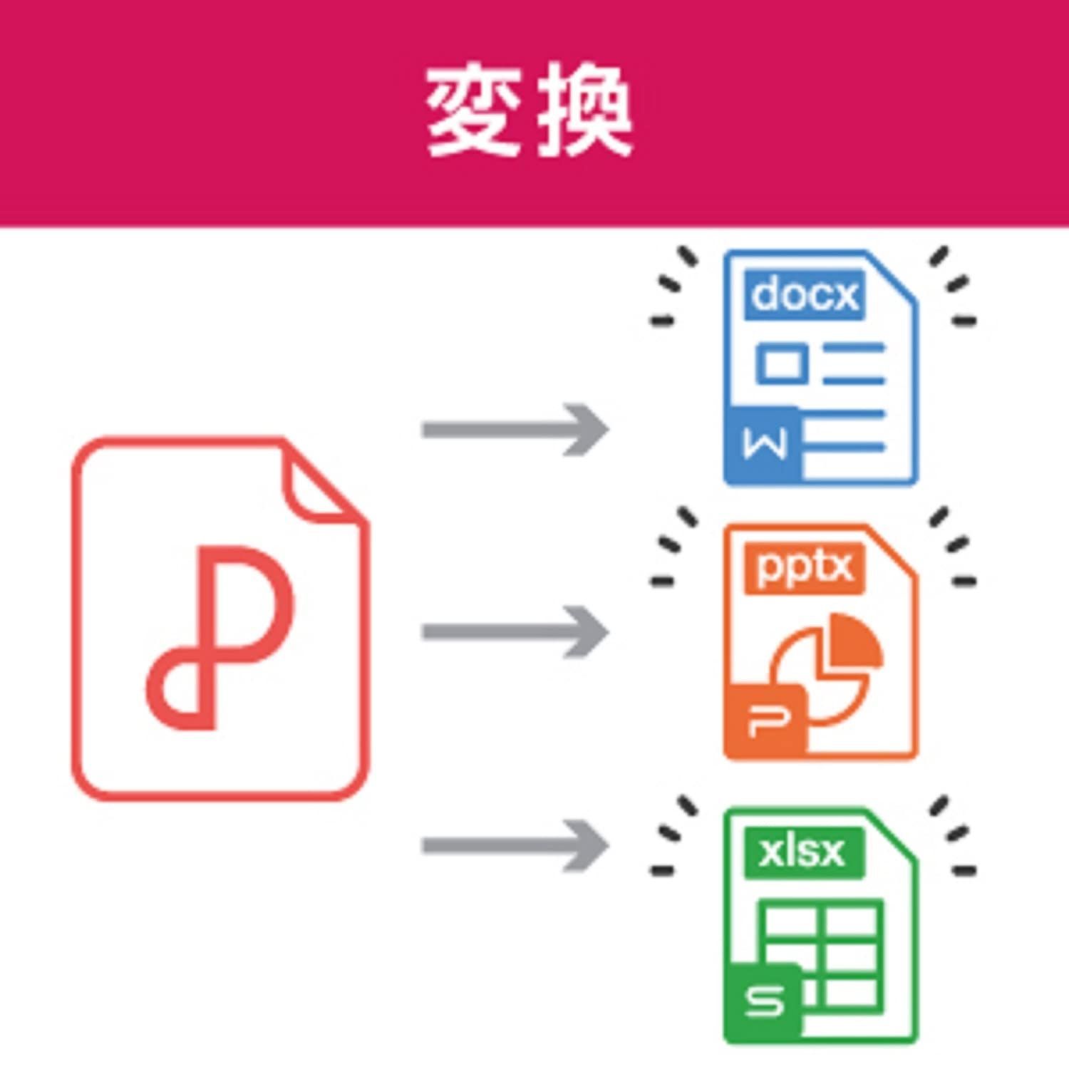 PDFファイルのレイアウトを保ったまま様々な形式のデータに変換します。複数のファイルをワンクリックで一括変換することが可能です。画像形式のファイルをPDFファイルへ変換することもできます。(※他のソフトウェアから直接PDFデータを作成することはできません。)