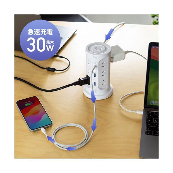 サンワサプライ USB充電機能付きタワー型タップ ホワイト TAP-