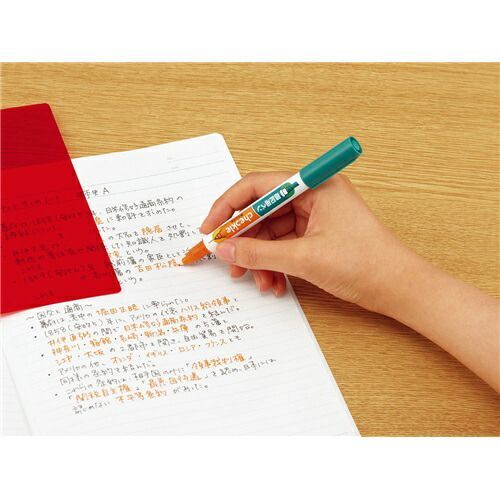 詳細情報●赤いシートを被せれば隠れる、文字の上から塗る緑色のペンと、書いた文字自体を隠せるオレンジ色のペンが1つになりました。どちらも赤いシートをかぶせれば隠れるので、効率よく暗記できます。