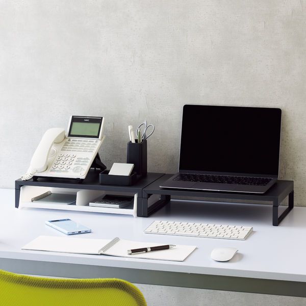 ○台の上にはPCモニターや電話、ラックなどが、下段はノートPCやデスク小物の収納にスッキリ収まりスペースUP!