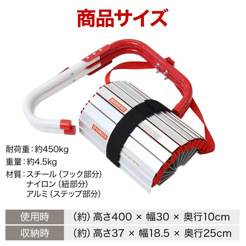 【商品詳細】 使用時サイズ:約(H)400×(W)30×(D)10cm 収納時サイズ:約(H)37×(W)18.5×(D)25cm 最大荷重:約450kg 重量:約4.5kg 材質:スチール(フック部分)・ナイロン(紐部分)・アルミ(ステップ部分) ※こちらの商品は一般家庭用緊急時避難梯子です。 消防法による消防用設備の設置義務にはご使用いただけません。※緊急時に使用するものです。据え置き設置等をして何度も使用するものではございませんので予めご了承をお願いいたします。