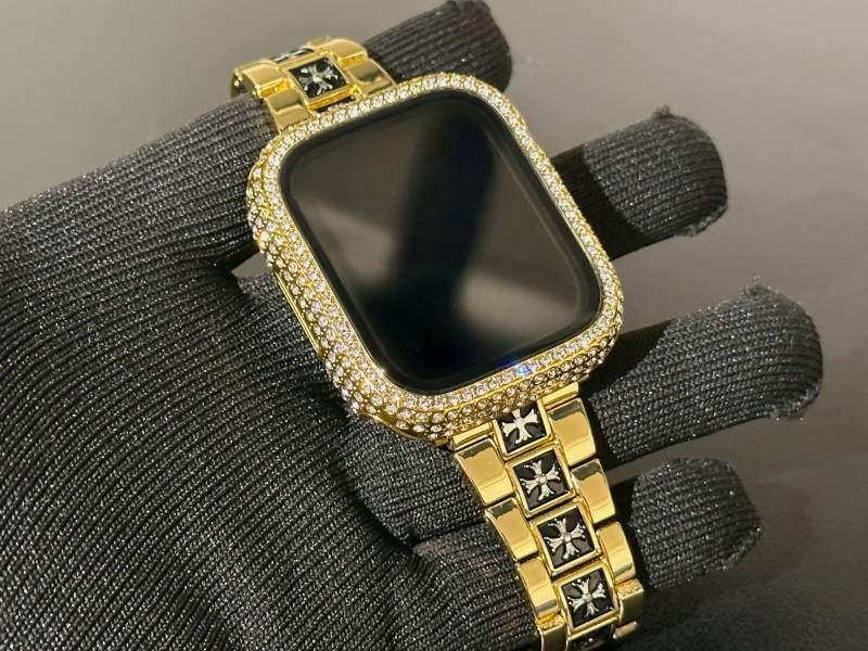 ゴールド Apple Watchメタルバンド glassパヴェカバー アップルウォッチ ステンレスベルト クロスデザイン リンクブレスレット 画面保護ケース キラキラ メッキ 41 mm 42 44 45 46 49 ultra ウルトラ