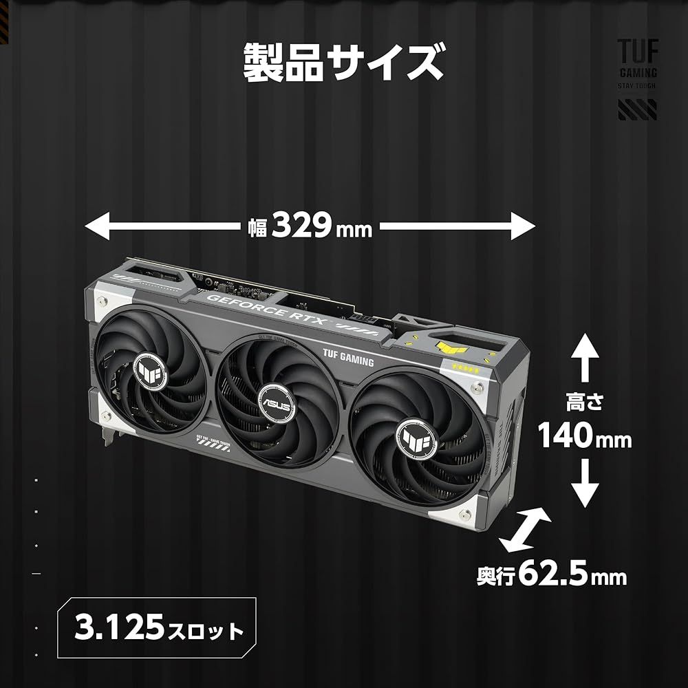 最大解像度:7680 x 4320 / 最大同時画面出力数:4 / サイズ :カード: 329 x 140 x 62.5 mm / 専有スロット: 3.125 Slot 「主な仕様」MaxContactデザイン:ASUS独自の製造プロセスで、GPUのヒートスプレッダの表面積を5%拡大。強力なヒートシンクとAxial-techファンと組み合わせることで、最大2°Cの温度改善を実現。
