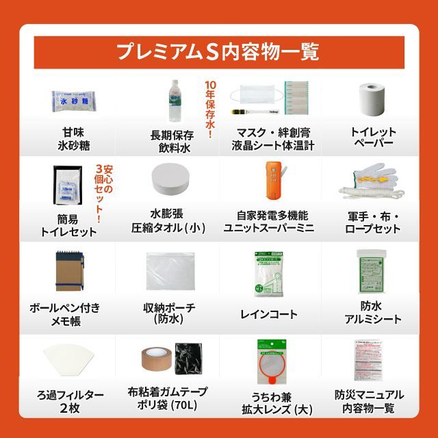 保存水500ml/氷砂糖/FMラジオ付多機能ライト/メモ帳&ボールペン/マスク/トイレットペーパー/簡易トイレ3枚/救急絆創膏/医療用体温計/圧縮タオル/アルミシート/収納ポーチ/ろ過フィルター/布粘着テープ/軍手・笛・ロープセット/雨衣/ごみ袋/拡大レンズ(大)/防災マニュアル