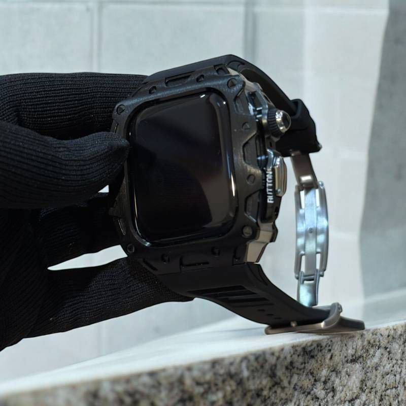 精緻なデザインと無骨なフォルムが特徴。Apple Watchをしっかり守りながら、ラグジュアリーでタフな印象を演出します。