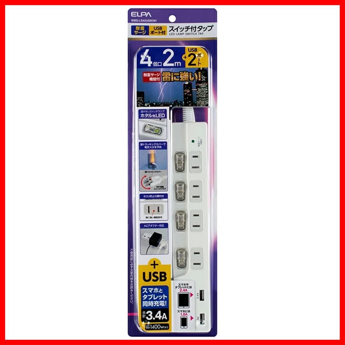 延長コード 口 電源タップ 2 m スイッチ付タップUSB 3.4 A ELPA WBS-LS 42 USB W エルパ