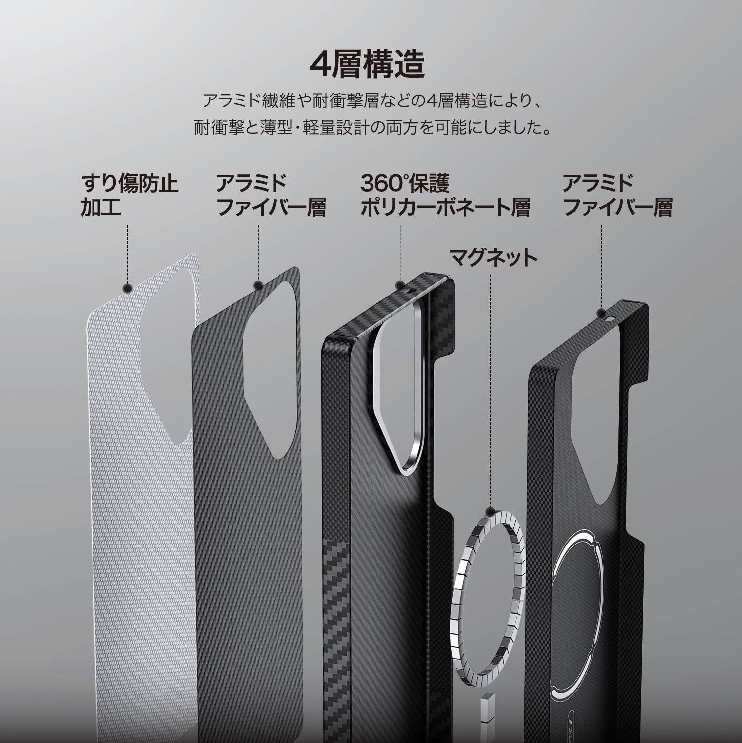 【4層構造】… アラミド繊維や耐衝撃層などの4層構造により、耐衝撃と薄型・軽量設計の両方を可能にしました。