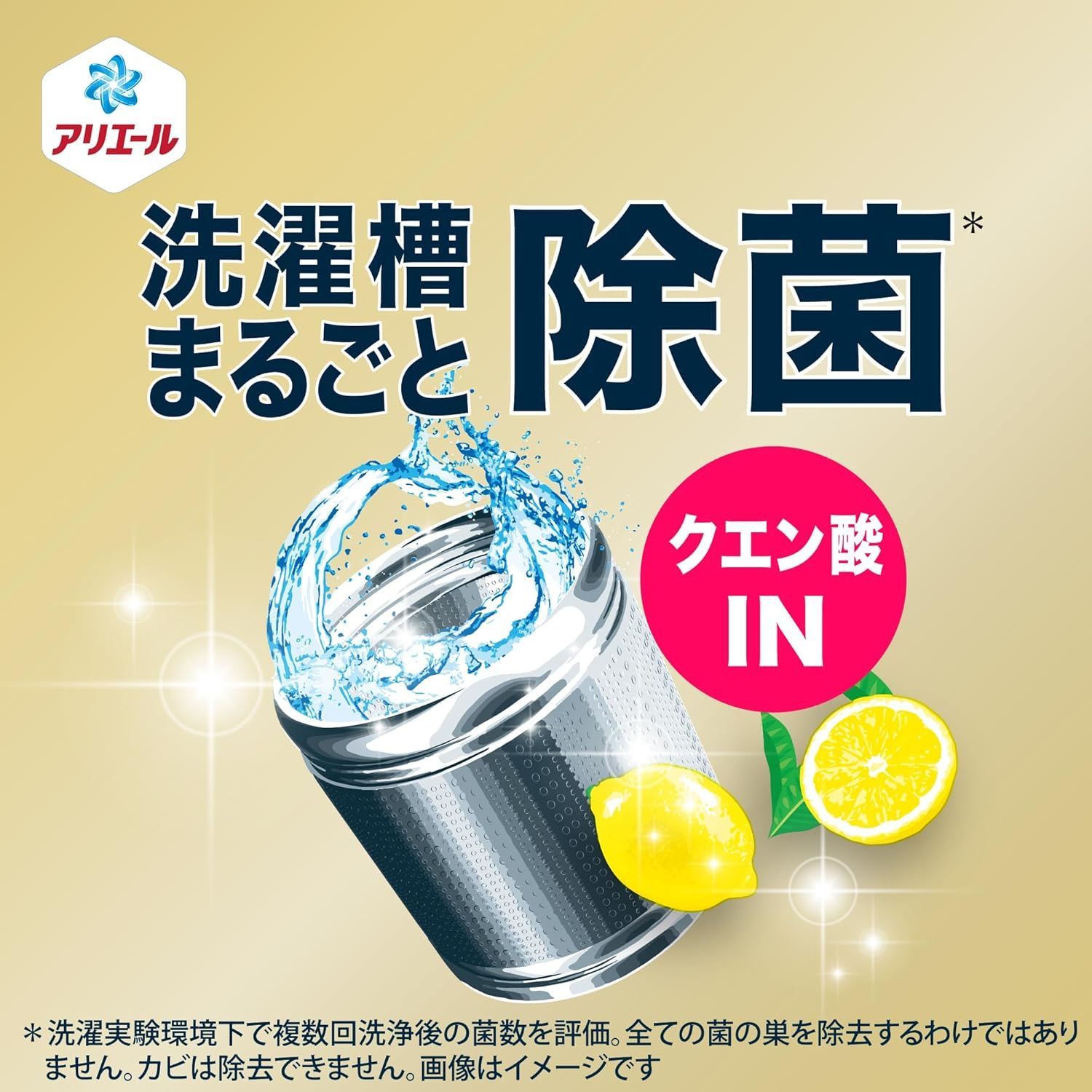 *1 P&G調べ。お出かけ着、体操着、作業着に関して。 *2 全ての菌を除去するわけではありません。 *3 ポリコットンでテスト。 *4 綿100%でテスト。 *5 P&G調べ。ニオイの度合いで消臭の程度は異なります。 *6 洗濯実験環境下で複数回洗浄後の菌数を評価。全ての菌の巣を除去するわけではありません。カビは除去できません。 *7 洗濯実験環境下で複数回洗浄後の菌数を評価。全ての菌の巣を除去するわけではありません。カビは除去できません。 *8 2023年のアリエール超抗菌プレミアムシリーズ比。