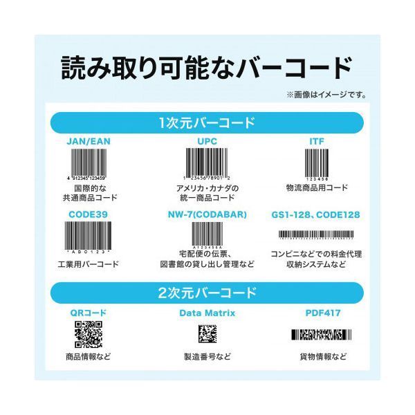 ■読取可能コード(1次元):EAN-8,UPC-A,UPC-E,NW-7(Codabar),Interleaved2of5(ITF),Industrial2of5,Code11,Code32,Code39,Code93,Code128,GS1-128,GS1Databar,GS1DatabarLimited,GS1DatabarExpanded
