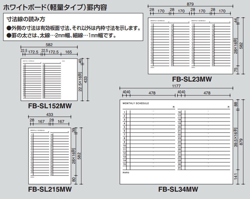 ●罫内容が月行事ヨコ書きで、軽量タイプのホワイトボードです。