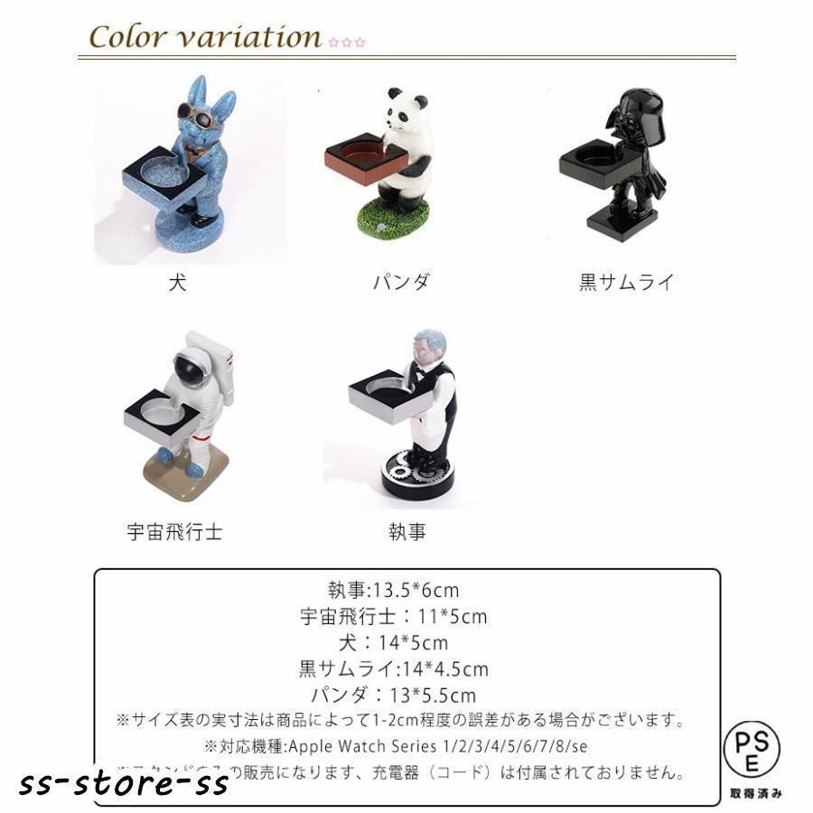 執事:13.5*6cm 宇宙飛行士:11*5cm 犬:14*5cm 黒サムライ:14*4.5cm パンダ:13*5.5cm ※サイズ表の実寸法は商品によって1-2cm程度の誤差がある場合がございます。※対応機種: Watch Series 1/2/3/4/5/6/7/8/se ※スタンドのみの販売になります、充電器(コード)は付属されておりません。