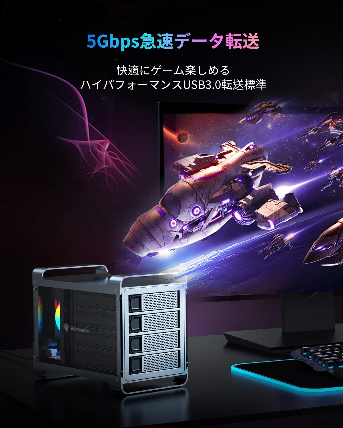 4台搭載 4 Bay外付けハードディスクケース ゲーミング SATA 3.0対応 RGBファン搭載 ハードドライブエンクロージャ USB 3.0接続 HDDケース アルミ 3.5インチ グレー DF U 3 Yottamaster