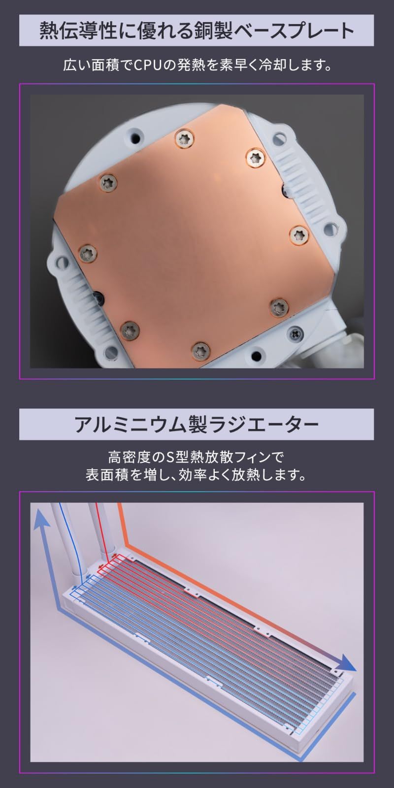 ファン中央部にインフィニティミラーデザイン採用:合わせ鏡の仕組みを利用したインフィニティミラーにより、奥行きのある幻想的なライティングが楽しめます。熱伝導性に優れる銅製ベースプレート:広い面積でCPUの発熱を素早く冷却します。アルミニウム製ラジエーター:高密度のS型熱放散フィンで表面積を増し、効率よく放熱します。