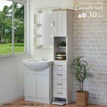 フランスの田舎町をテーマとした自然体で飾らないデザインのランドリー収納です。農園のある田舎町で使われているような温かみのある色合いやデザインにもこだわったフレンチカントリー家具です。洗面台や洗濯機横の隙間を収納スペースへと変えてしまう収納ラックです。扉収納とオープン収納、引き出し収納の組み合わせで、洗剤やタオルコスメなどの小物類も収納可能です。