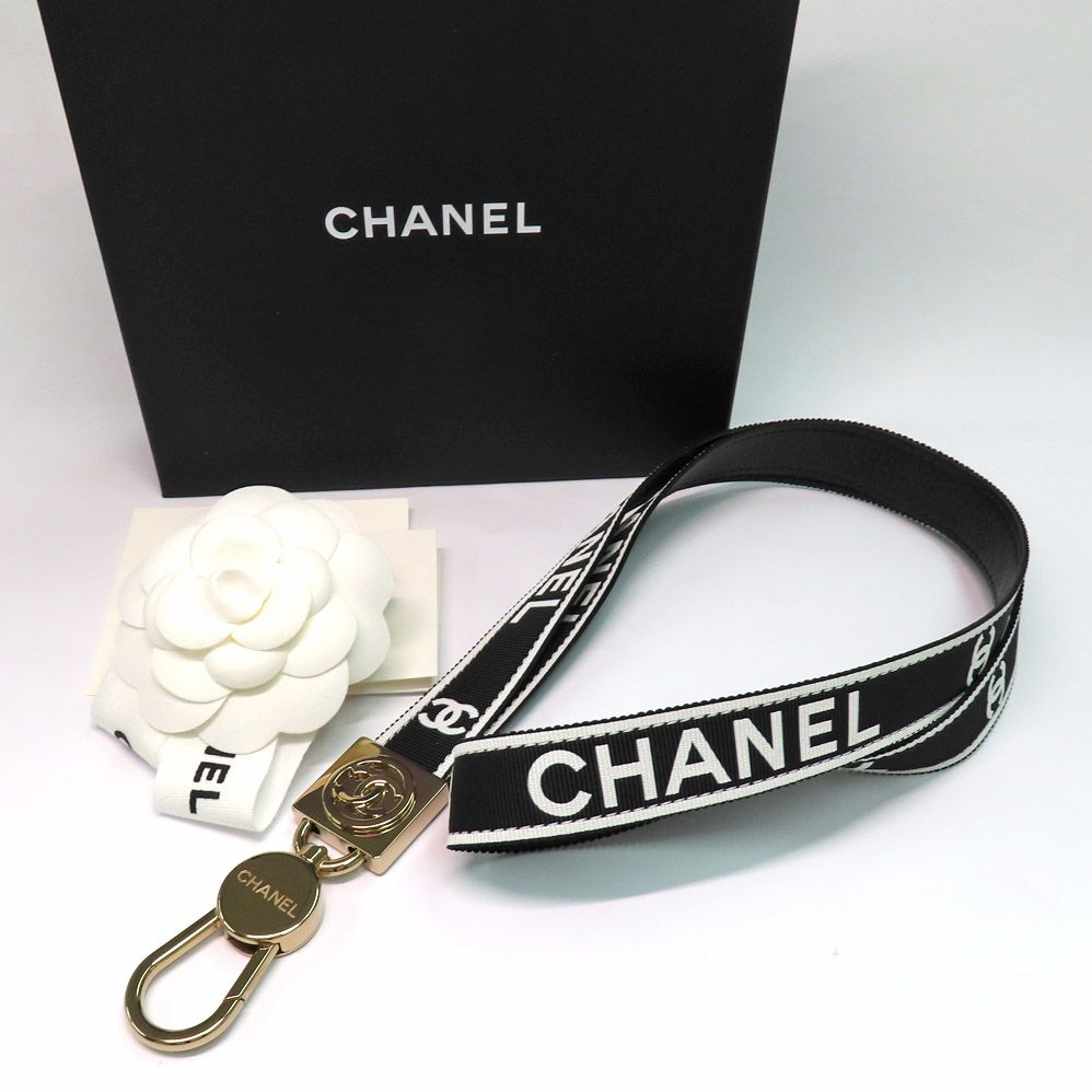 名古屋 シャネル ネックストラップ AAA 911 B 25 P ブラック ホワイト キャンバス レザー シャンパンGD金具 小物