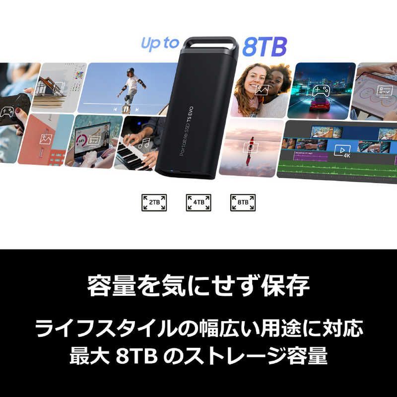 SamsungのT5 EVOポータブルSSD は、ライフスタイルの幅広い用途に対応する最大8TB のストレージ容量を備えています。