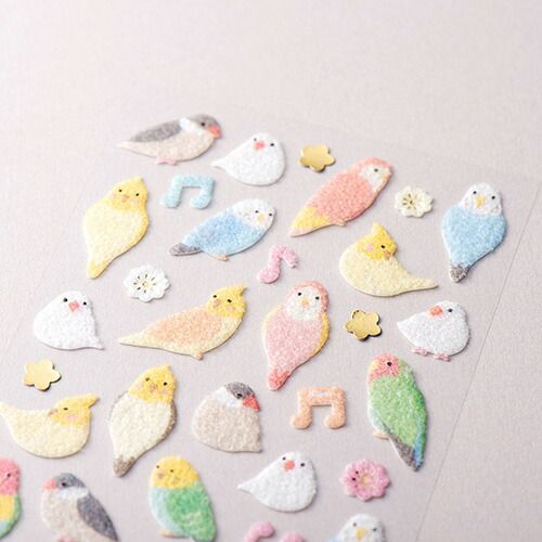 モチーフのインコや文鳥とふわふわした素材のヴィベールが相性の良いデザインです。キラリと光る金箔押し加工がアクセントになっています。カラフルな鳥たちは貼るだけで目を引きます。【検索ハッシュタグ】#シール#ステッカー#金箔#箔押し#とり#トリ#鳥#アニマル#動物#エヌビー#NB#bird#バード#トリ