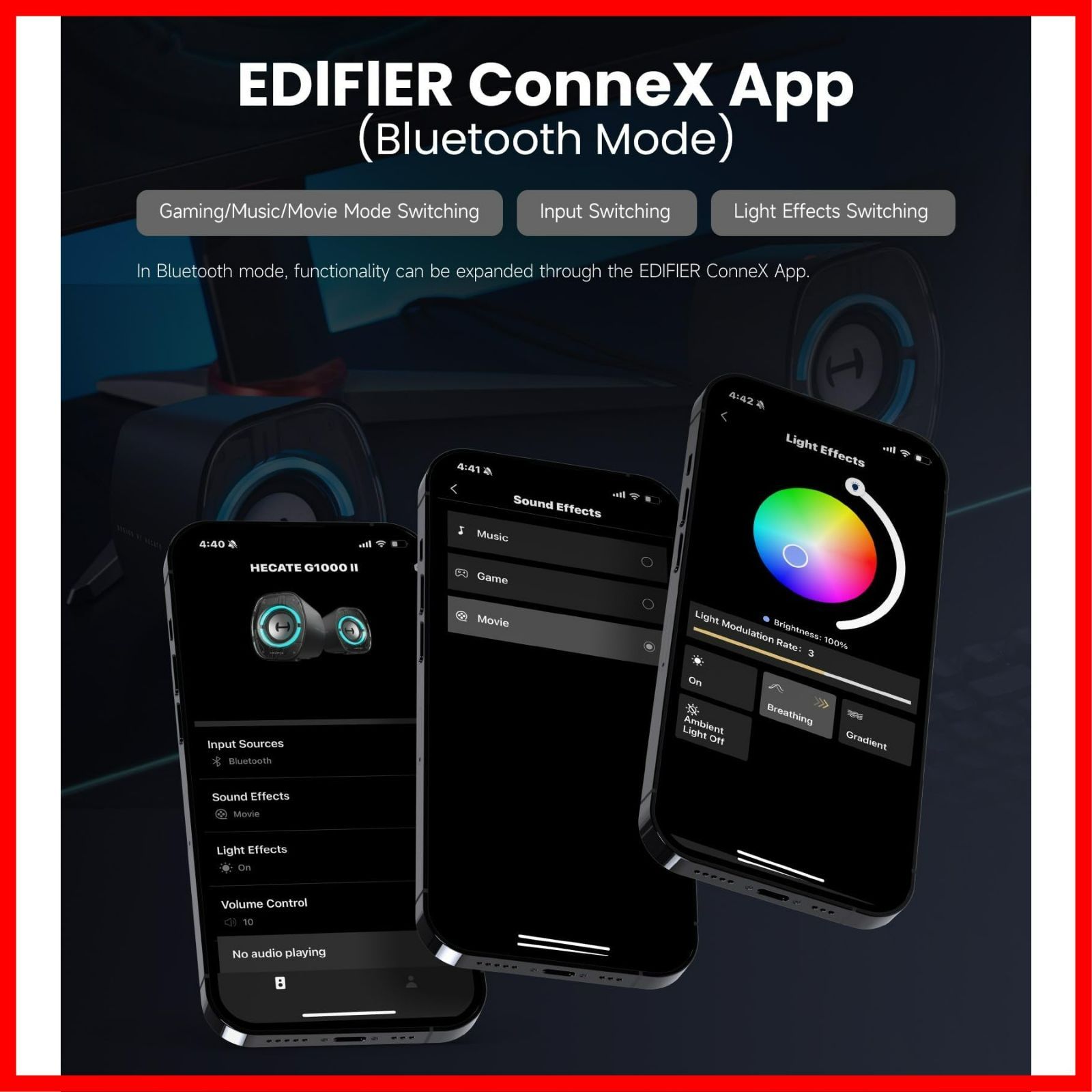 3 種類 EQ モード(ゲーム / 映画 / 音楽):各シーンに特化した音質調整でイマーシブ体験を提供、ゲームの臨場感を高め、映画の音場を広げ、音楽の細部を活かす