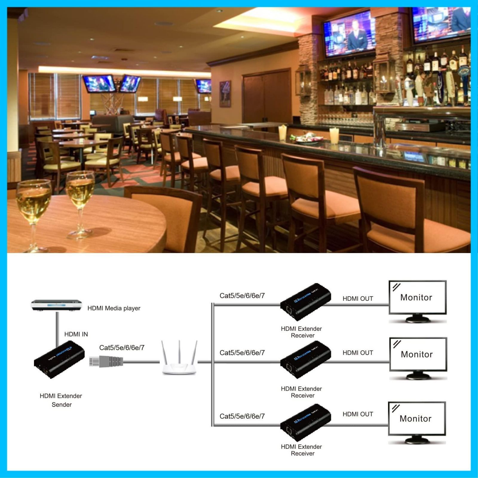 HDMIエクステンダーと分配器機能に対応しています。送信機1台から受信機N台までに接続することが可能です(理論上は、最大で253台です)。 送信機をワイヤレスルーター1台に接続し付加的なイーサネットポートを使って、複数の受信機に接続し、そこから複数台のテレビに繋ぐことができます。分配器としても機能するエクステンダーです!