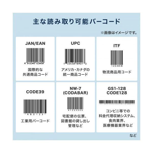 ■読取可能コード(1次元):EAN,UPC-A,UPC-E,NW-7(Codabar),Interleaved2of5(ITF),Industrial2of5,Code39,Code128,Code93,Matrix2of5,ISSN,ISBN,MSI,GS1-128,GS1Databar,GS1DatabarExpanded