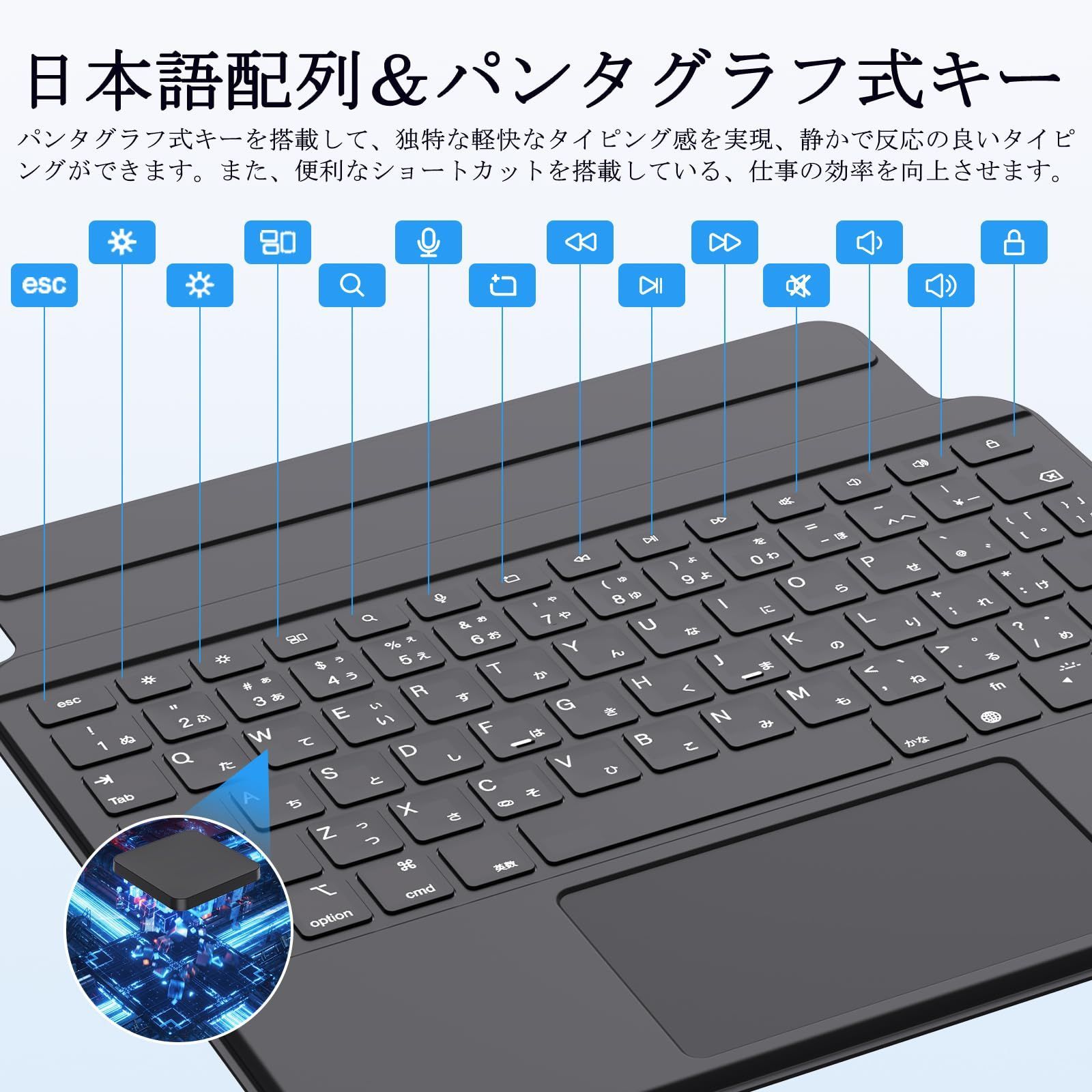 【iPad用キーボード付きケース】SUKEBONキーボード付きケースは技術基準適合証明認証済み、ノートPCのような快適なタイピングを実現できます。iPadOSでの作業方法を広げるトラックパッド、充電ができるUSB-Cポートを搭載。磁気設計脱着式で、クイックセットができ、縦も横も使用可能です。キーボードに分けるとデバイスを守る頑丈なカバーにもなります。
