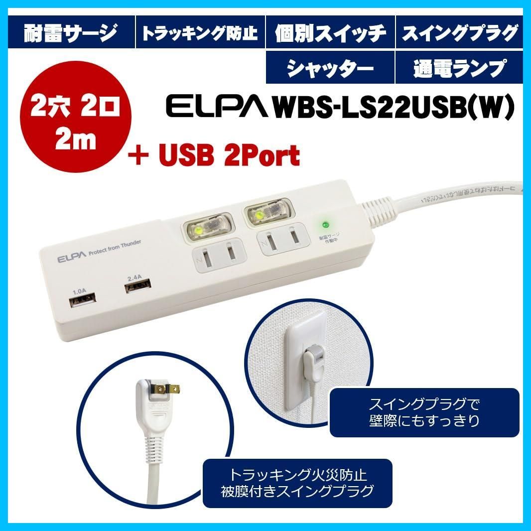 延長コード 口 電源タップ 2 m スイッチ付タップUSB 3.4 A ELPA WBS-LS 42 USB W エルパ