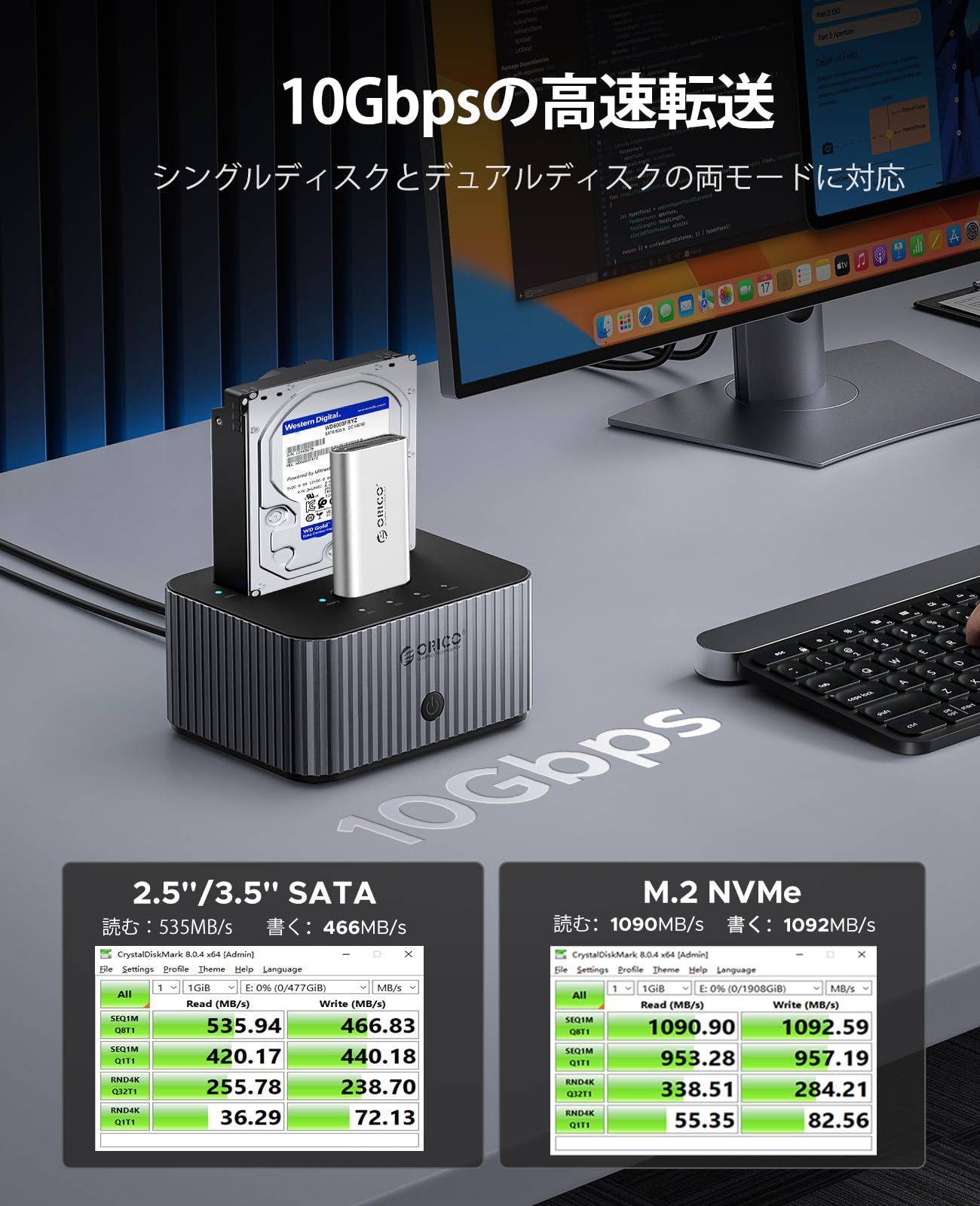 SSD と 2.5 3.5 SATA NVMe HDD SSD両対応 アルミニウム合金 M.2 スタンド クローン オフラインクローン USB 3.2 Gen 2 10 Gbps高速データ転送 クロー