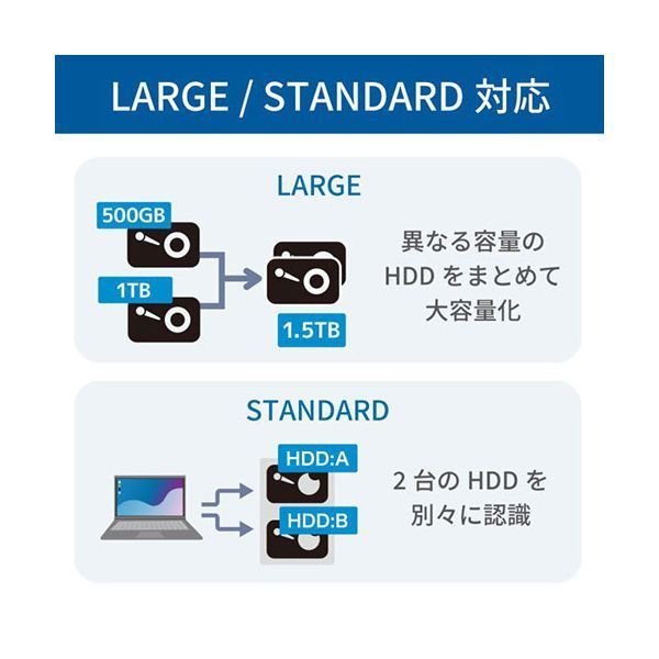 動作モードは、「RAID1(ミラーリング)」「RAID0(ストライピング)」「LARGE(スパンニング)」「STANDARD」の4つを備えています。