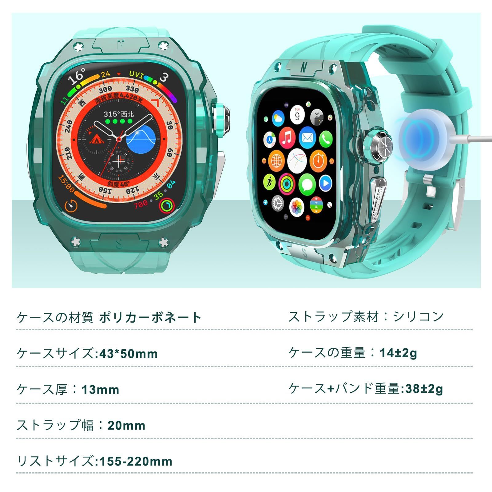 カバー付き 49 mmバンド 高耐久 1 2 頑丈なケース Ultra シリコンストラップ 男性 女性用フル保護カバー Watch 透明マット白 軽量透明ケース用Apple ミント 青