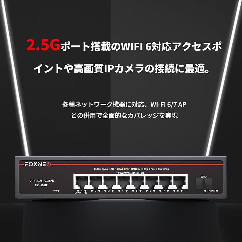 商品名:FOXNEO 2.5G PoE スイッチングハブ | 8ポートPoE(最大60W)+ 1ポート10G SFP+ | IEEE 802.3準拠 | 自動MDI/MDIX対応 | 高速ネットワーク・安定性のための高効率設計 | ファンレス設計 (9ポート │ 2.