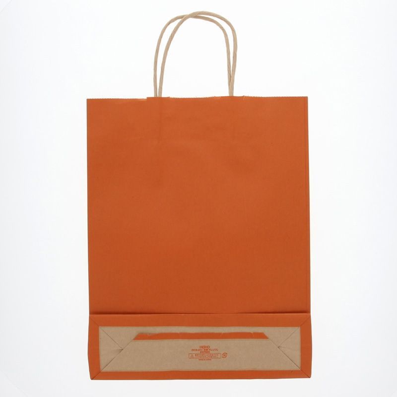 クラフト紙にオレンジベタを印刷した手提げ紙袋です。色落ちを緩和させるために、上からニスを塗布しています。A4サイズの収納に適した規格です。