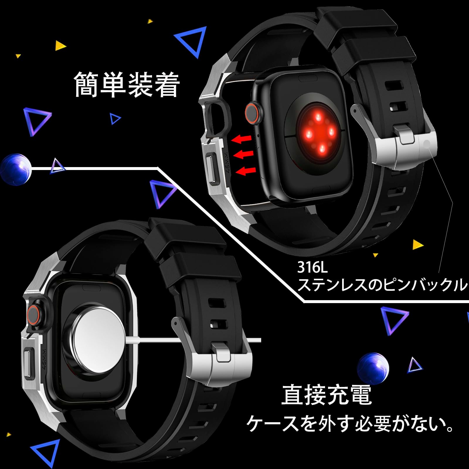 BinGeLi コンパチブル Apple Watch バンド 44 mm 45 46 49 ステンレス鋼 頑丈なメンズ フッ素ゴムベルド 一体型 スポーツ Series 9 8 7 SE 2 6 5 4 Ultra