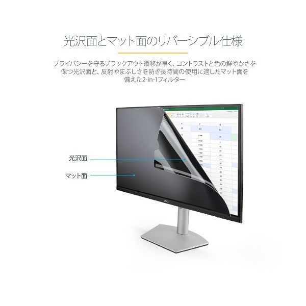 ●アンチグレアマット仕上げ(反射防止/無光沢)、または光沢仕上げの両面使用が可能で、どんな照明下でもシャープでクリアに視認できるリバーシブル覗き見防止フィルムです。
