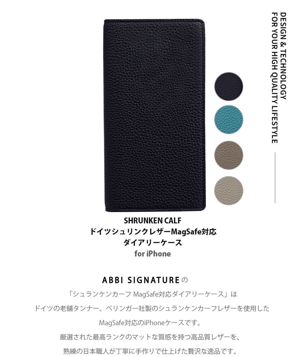 ABBI SIGNATUREの「シュランケンカーフ MagSafe対応ダイアリーケース」はドイツの老舗タンナー、ペリンガー社製のシュランケンカーフレザーを使用したMagSafe対応のiPhoneケースです。厳選された最高ランクのマットな質感を持つ高品質レザーを、熟練の日本職人が丁寧に手作りで仕上げた贅沢な逸品です。