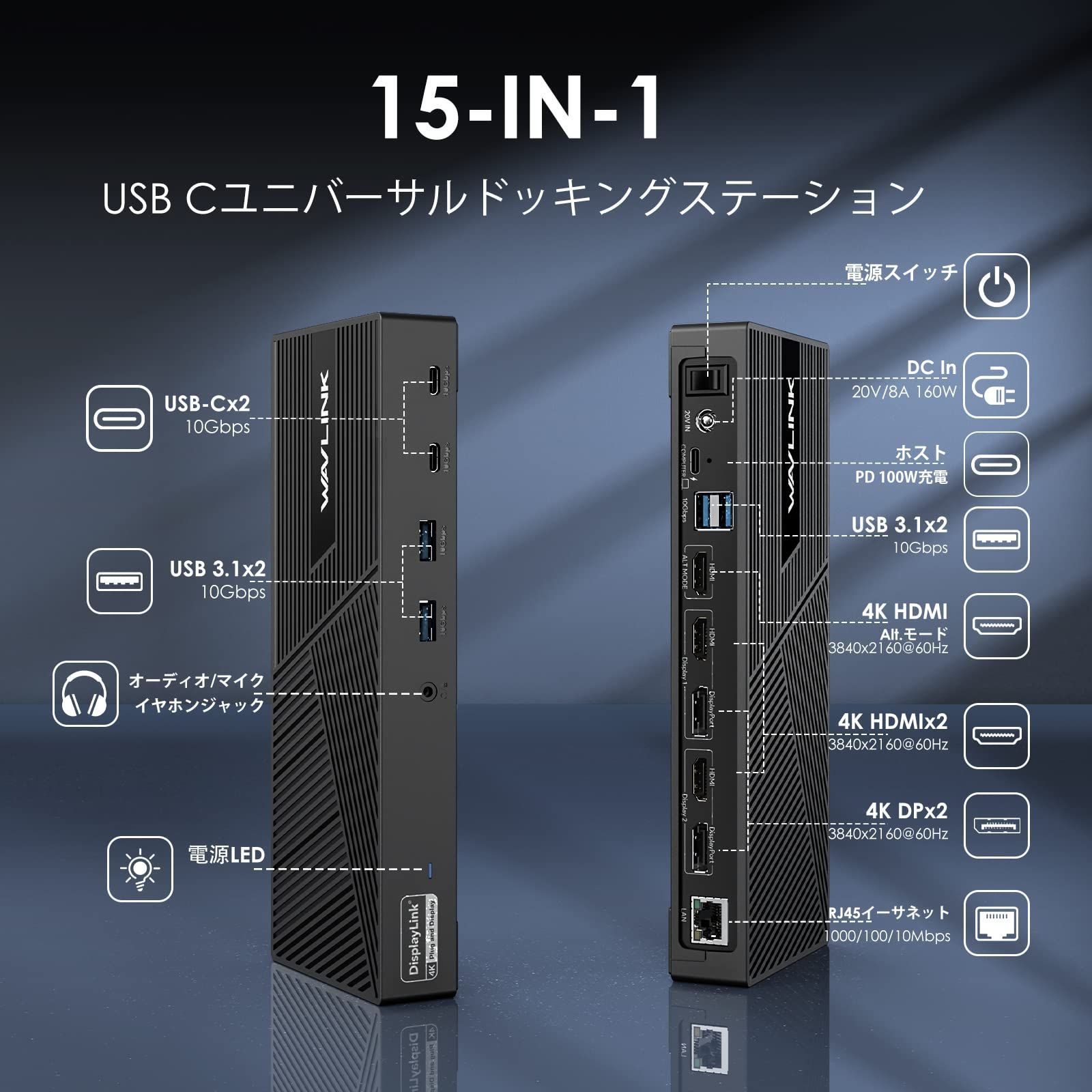 WAVLINK トリプル4Kディスプレイドッキングステーション 15-In-1 USB C ユニバーサル パソコンドック 三重モニター 3xHDMI 2xDisplayPort PD100Wホスト充電 10Gbpsデータ転送 Windows/Mac OS対応 …