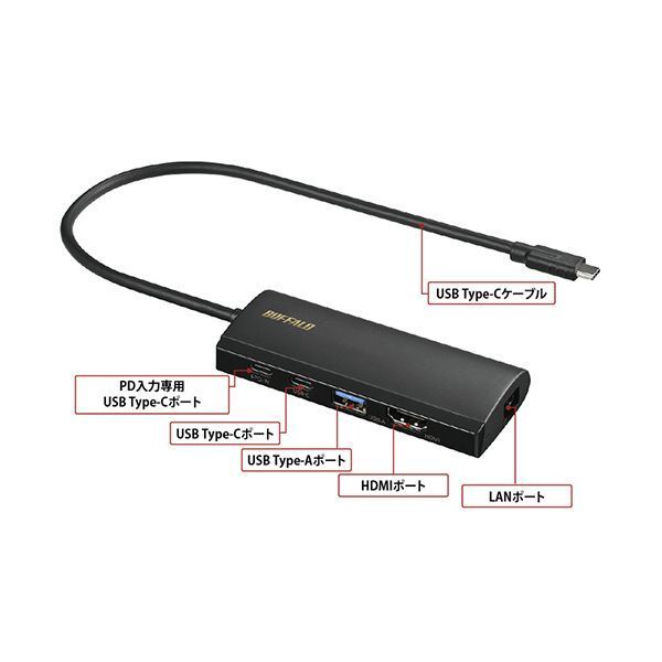●USBポート:[パソコン側]Type-Cオス×1、[周辺機器側]USBType-Cメス×1(給電用、USBPD対応最大入力100W)、USBType-Cメス×1(通信用USB3.2(Gen1)最大電流900mA)、USBType-Aメス×1(通信用USB3.2(Gen1)最大電流900mA)