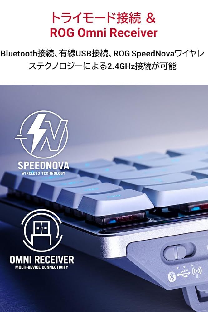 トライモード接続: Bluetooth接続(最大3台まで同時接続可能)、ROG Speed Novaワイヤレステクノロジーによる2.4GHz接続、有線USB接続が可能