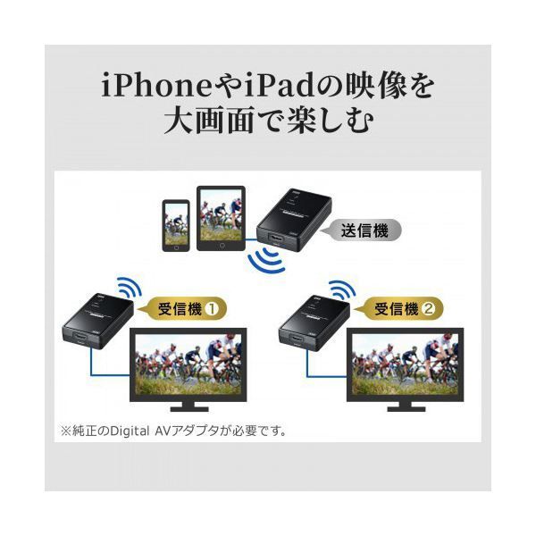 ●HDMI信号をフルHD(1920×1080ドット)解像度で最大30mまで、2か所にワイヤレス分配出力することができます。(※使用環境によります。)