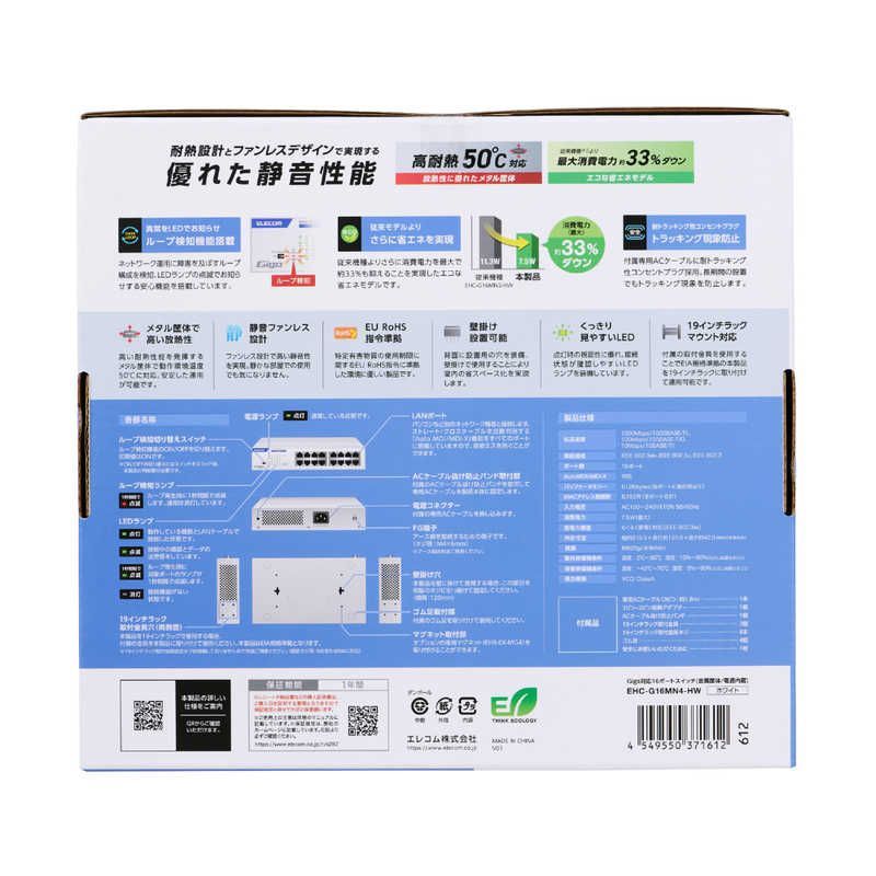 エレコム ELECOM スイッチングハブ 16ポート ギガビット 金属筐体 内蔵電源 静音ファンレス ループ検知 ラックマウント対応 ホワイト EHC-G 16 MN 4-HW