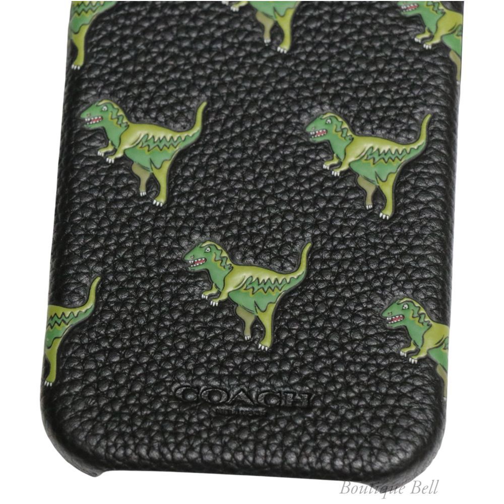 COACHの人気アイコンキャラクター「レキシー(恐竜)」がデザインされた、遊び心溢れるプレミアムなiPhoneケースです。上質なブラックレザーに、グリーンのレキシーがあしらわれた愛らしいパターンが特徴で、ラグジュアリー感と可愛らしさが絶妙に融合しています。