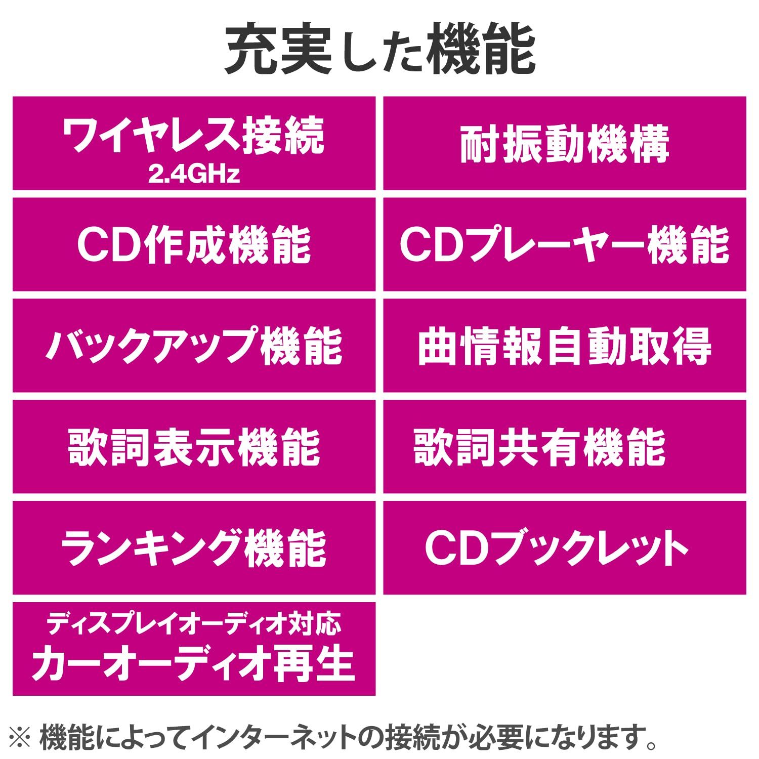 iPhone・iPadやAndroidのスマートフォン/タブレットとワイヤレス接続で、付属のアプリを使って、音楽CDの録音/再生ができるワイヤレスDVDドライブです。3ステップのカンタン操作で、音楽CDをスマホに取り込み、音楽再生させることができます。パソコンを使う必要はありません。取り込んだ音楽は、自動でアーティスト名、曲名、アルバム名、アルバムジャケット写真を表示させることができます。さらに歌詞を表示させることができ、再生に合わせて歌詞を追う事ができます。歌詞の表示は、お友達のスマホへも表示させることができる機能があるため、カラオケが一緒にできます。CDブックレットやランキング機能もあるため、アーティスト情報や、ランキングの表示ができ、ファンであるアーティストの情報を追う事ができます。取り込んだ音楽をカーナビで再生させる事ができるディスプレイオーディオ機能搭載。車で音楽再生させることができます。(カーナビがCarPlay、Android