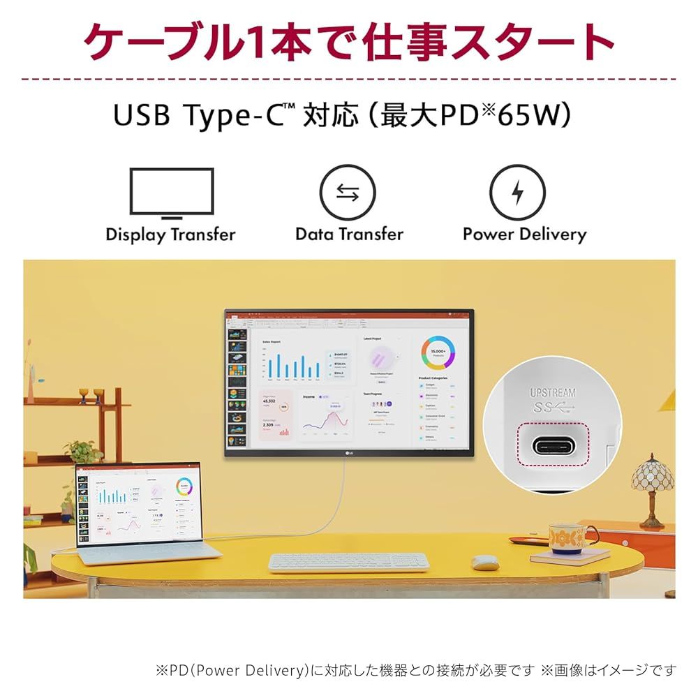 【ケーブル一本で、仕事スタート!】 USB Type-C (USB Power Delivery 65Wまで) ケーブル1本でディスプレイ接続、給電*(65Wまで)、そしてデータ転送まで可能なUSB Type-C端子