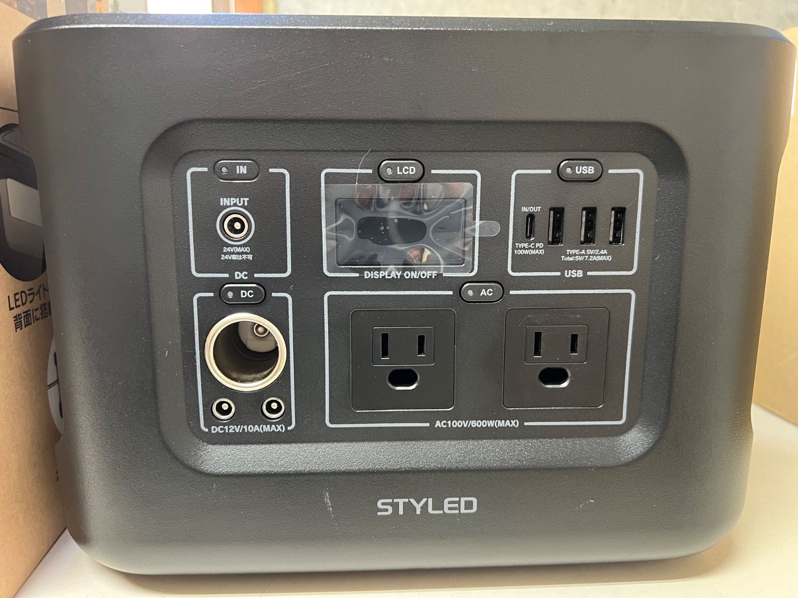 O 6 47 STYLED ポータブル電源 622 Wh AC 2口 USB 3ポート PD 100 W Type C搭載 LEDライト付き