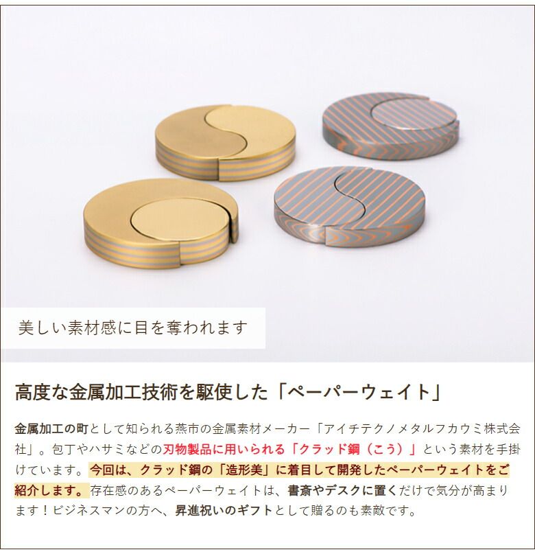 刃物製品に用いられる素材「クラッド鋼」でできたペーパーウェイト。異なる金属素材の組み合わせや、それによって生まれる美しい模様を楽しめます。男心をくすぐるアイテムは、ギフトにもどうぞ!