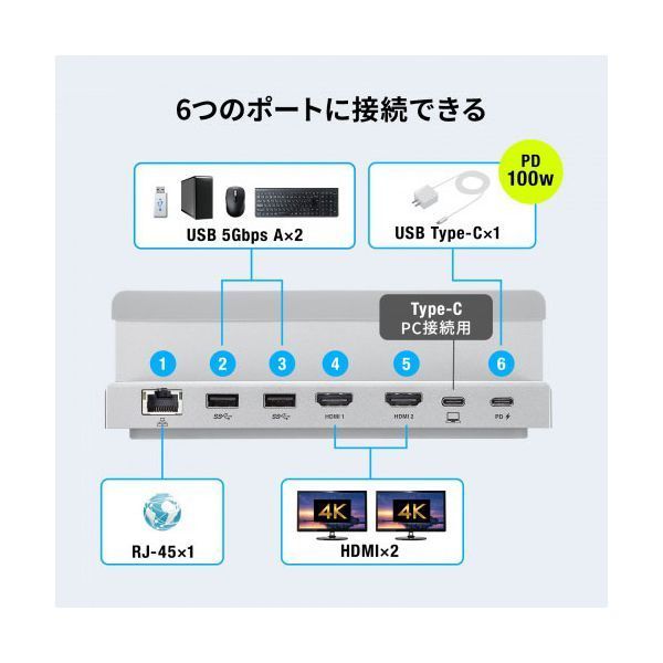 ●ディスプレイを最大2台接続可能で、2台接続時の最大解像度は各ポート最大4K(3840×2160)/30Hzまでサポートします。