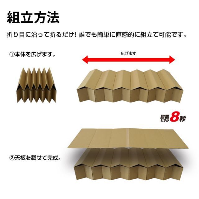 ●蛇腹状の本体をパッと広げて、天板を載せるだけ、わずか8秒!どなたでも簡単に使えます。
