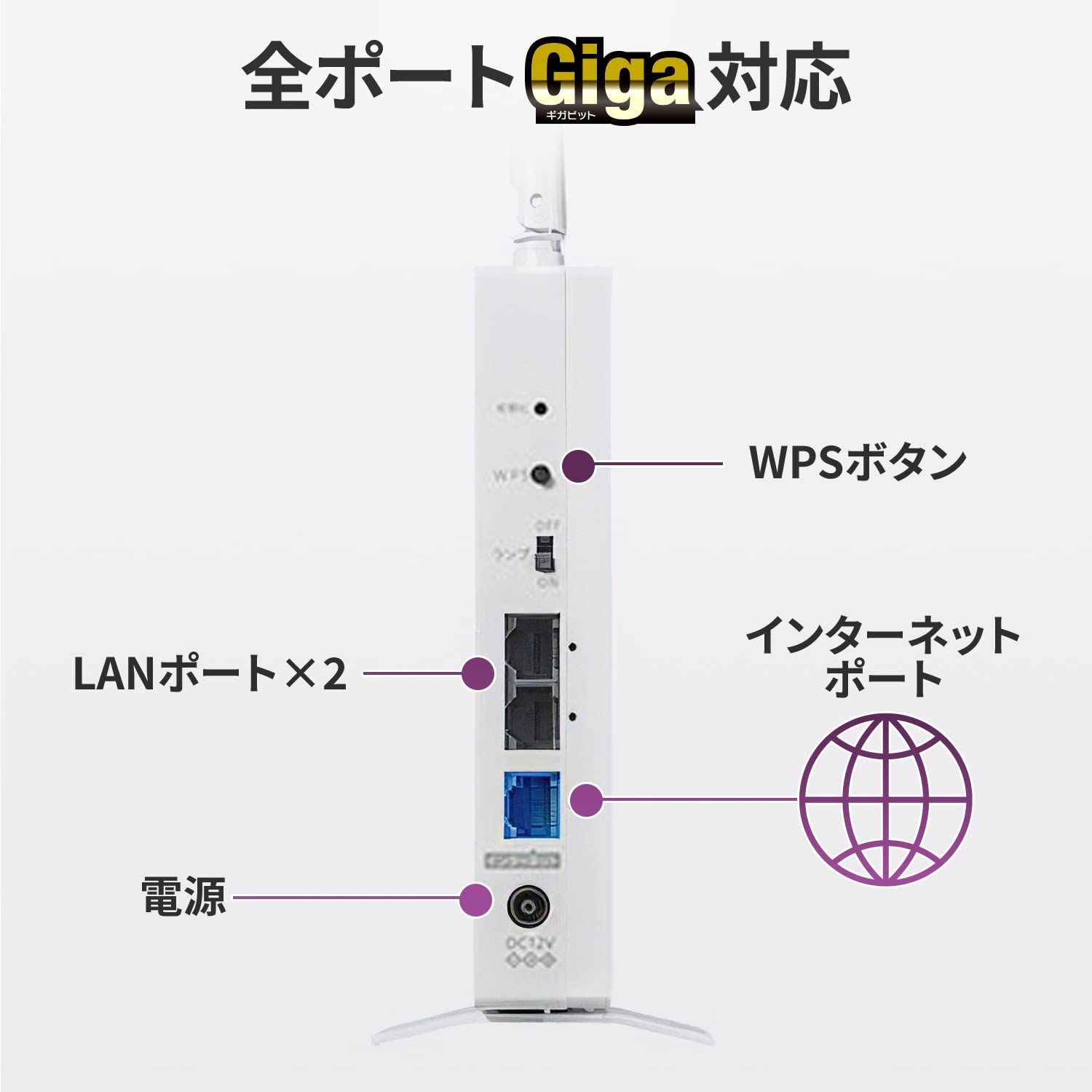 ■Wi-Fi 6(IEEE802.11ax)に対応し、5GHz最大1201Mbps(規格値)、2.4GHz最大574Mbps(規格値)の高速通信が可能なWi-Fiルーターです。 ■可動式アンテナを搭載し、設置場所やお部屋に合わせて最適な方向にWi-Fiを飛ばすことが可能です。 ■ご利用のインターネット回線の接続方式を自動で判別し、適切な動作モードでインターネットにつながり、設定不要です。 ■「IPv6(IPoE)」に対応し、当社独自の通信技術「IPv6ブースト」に対応しているため、「IPv6」を利用した高速なインターネット通信がご利用いただけます。