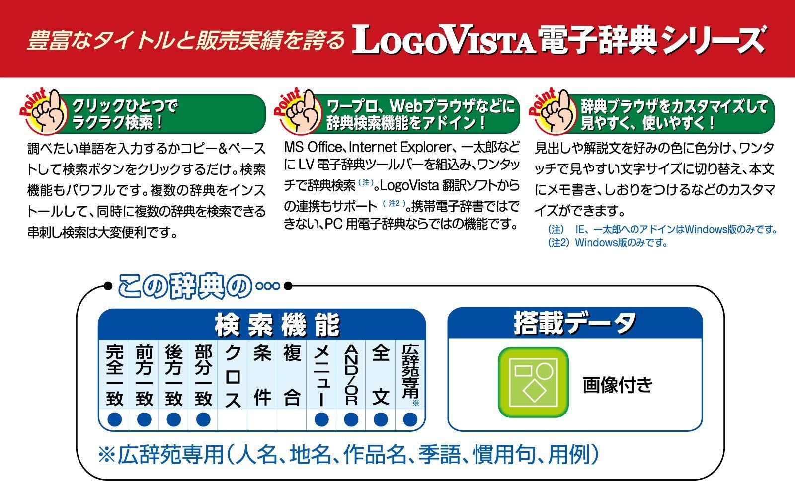 『広辞苑 第六版』に収録されている項目を分野ごとに抽出し、各界の専門家が全面的に校閲。文学・歴史から物理学・医学、美術・音楽に武芸・茶道、スポーツ・サブカルチャーまで、学問の研究の進展や最新の動向を反映し、より正確で簡潔な解説に改めました。第六版刊行後に収集した言葉に加えて、旧版までは採用しなかった言葉もあらためて検討し、日本語として定着した語、または定着すると考えられる言葉を厳選。「朝ドラ」「がっつり」「ビットコイン」など新たに一万項目を追加しています。書籍には含まれないカラー画像も収録。「LogoVista電子辞典シリーズ」は、初めての方にも簡単に使える高性能検索ソフト「LogoVista電子辞典ブラウザ」を搭載しています。調べたい単語を入力するかドラッグ&ドロップして検索ボタンをクリックするだけで検索できます。また、解説文を好みの色に色分けしたり、見やすい文字サイズにワンタッチで切替え本文にメモ書きしたり、しおりをつけることができるなど、辞典ブラウザをカスタマイズして見やすく、使いやすくすることができます。さらに、Microsoft Office、Internet Explorer、一太郎などにLV電子辞典ツールバーを組込み、ワンタッチで辞典検索も可能で、LogoVista電子辞典ソフトとの連携もサポートしています(IE、一太郎へのアドインは、Windows版のみ)。そのほか、操作方法をわかりやすくナビゲートする「LVナビ」や、新製品情報、アップデート情報などのLogoVista製品情報をいち早くRSSでお知らせする「LogoVistaニュース」も搭載しています。